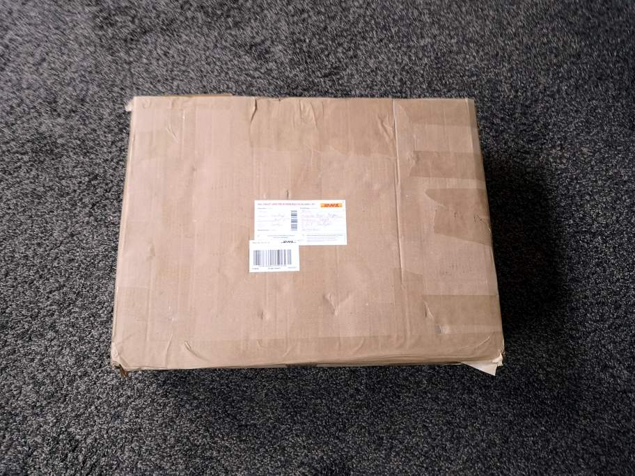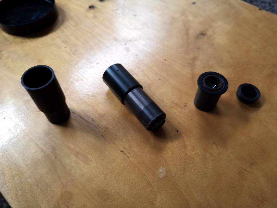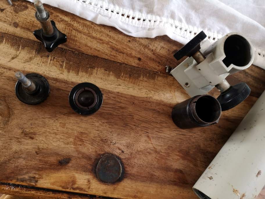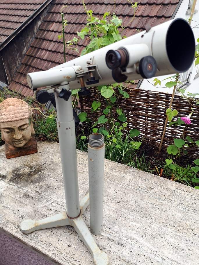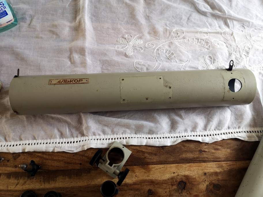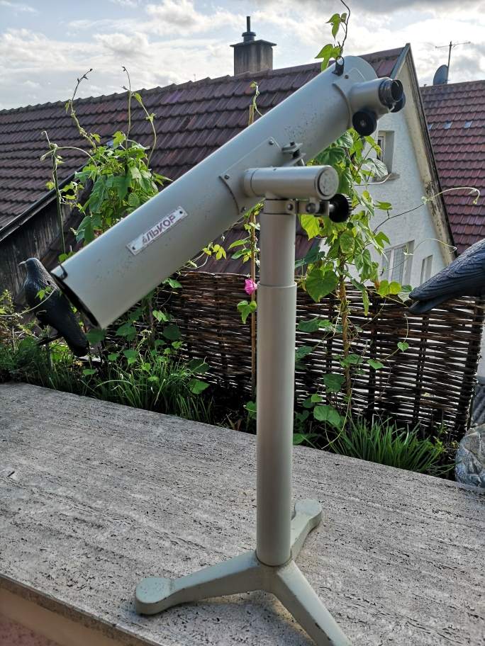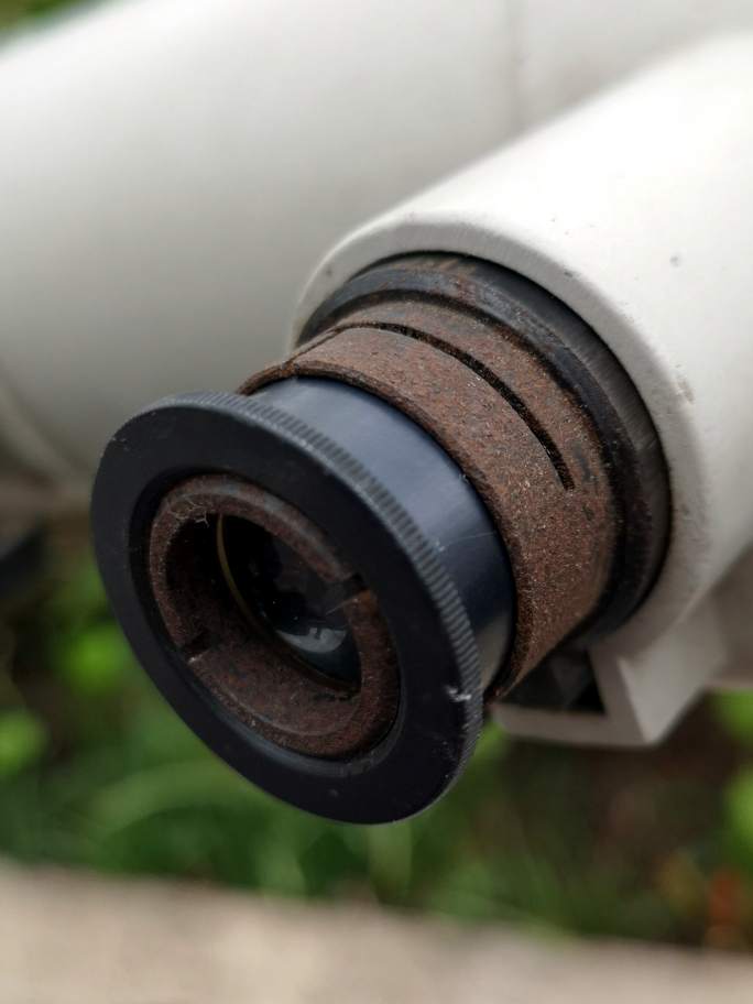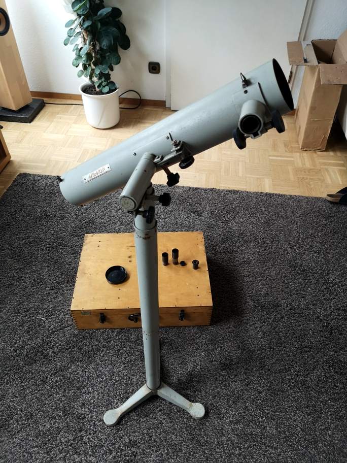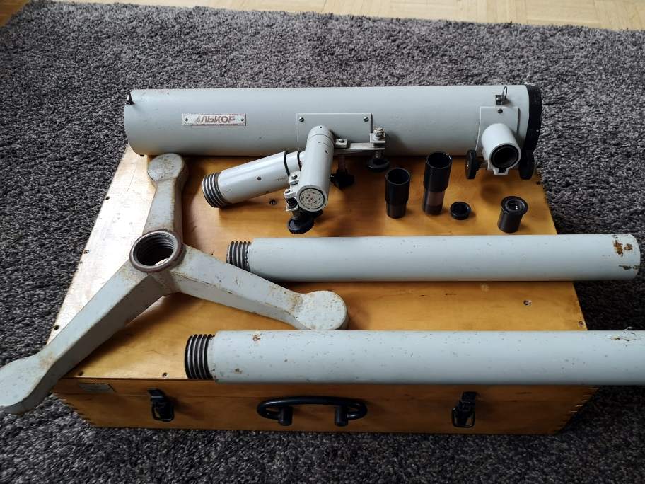 Ja, da stand dann also im Treppenaufgang ein gut verpacktes - gar nicht mal sooo großes Paket. Neugierde groß, schnell hoch und ausgepackt. Wunderbar, alleine schon diese Holzkiste. Geöffnet und ... alles drin. Schön. Aaaaber ... es deutete sich sofort eine fulminante Reinigungssession an: Alles verstaub- schmockt, Rost und diese komische "Watte" auf dem Holz zum Lagern/Polstern der Teile: die hat sich aufgelöst und in eine klebrige Masse verformt, die überall "anpappte". Also ... gab was zu tun. Zunächst aber erstmal: Zusammenbauen. Ging auch schnell, die beiden Säulensegmente in den Fuß geschraubt, darauf dann die azimutale Montierung mitsamt dem Tubus. Fertig. Nun konnte man auch im aufgebauten Zustand den Zustand ermessen: Schmutz, Schmier und Rost allenthalben. Muss wirklich eine feuchte und muffige Umgebung (... auf Nachfrage: "... stand lange in einem Schuppen ...". Ja, das muss wohl seeeehr lange gewesen sein. Es stellte sich zumindest heraus, das der kleine Tal noch aus Zeiten der Sowjetunion stammte; steht doch auf dem in der Kiste eingeklebten Zettel etwas von "12/86". Also noch ein - mittlerweile 36 Jahre alter - UdSSR-Tal). Auch am 15er Ramsden-Zweilinser-Okular Rost und Schmutz auf den Linsen. Die Barlow und die Verlängerungshülse, okay. Überraschend ein beigelegter Okular-Sonnenfilter mit schönem blauweisslichem Bild. Was ist denn nun mit dabei?