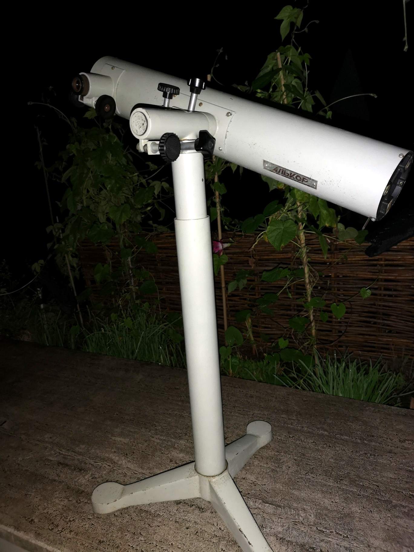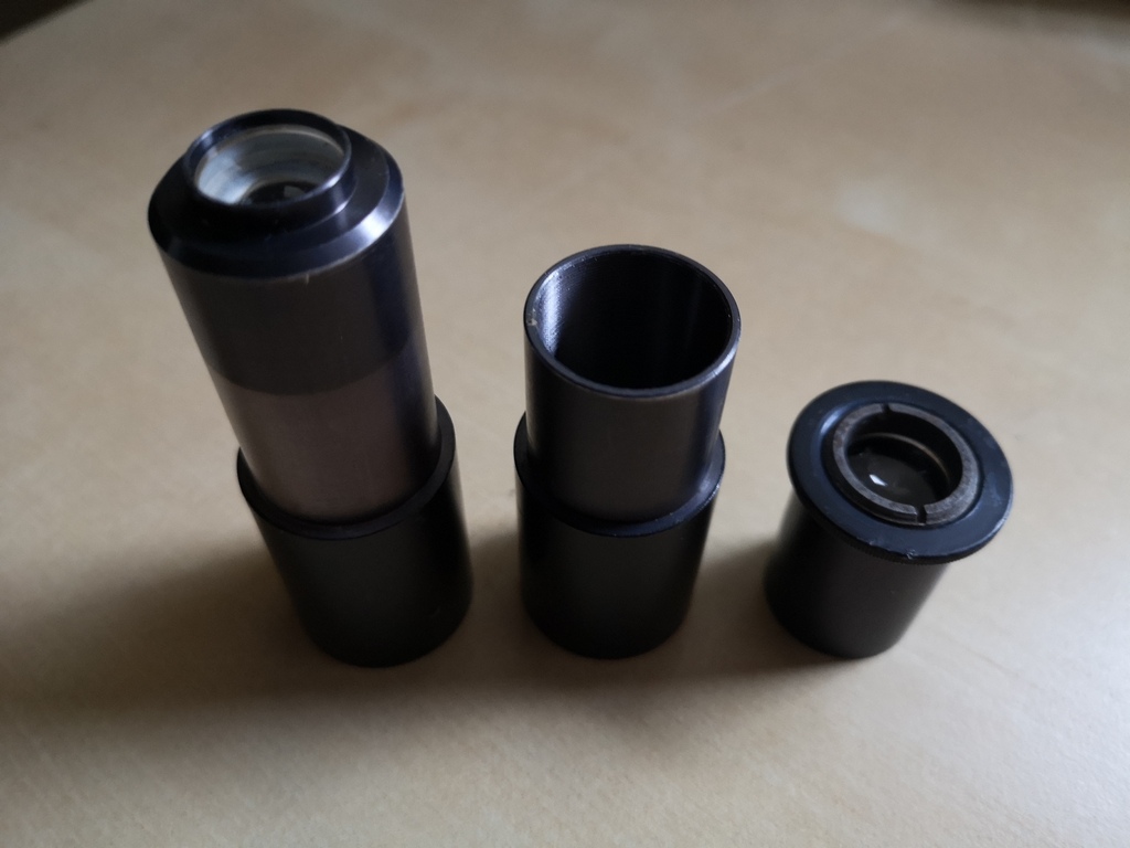 Also, nach ausgiebiger Reinigungs und einer kleinen FS-"Justage" (das Blech, an dem der FS befestigt ist, musste ein klein Wenig in die richtige Richtung gebogen werden, so daß der HS nun komplett im FS erkennbar war) gab es doch tatsächlich einige Wolkenlücken: also gleich mal raus den Lütten auf den Balkon. Echt pfiffig: die Säule besteht aus zwei zusammenschraubbaren Segmenten; eines dann raus - und fertig ist das Tisch- bzw. Balkonteleskop. Zunächst musste ich mich mal an den Peilsucher gewöhnen (sofort der Gedanke: wie bekommt man - ohne rumzubohren - einen kleinen 6x30er Sucher montiert; mal sehen ...). Naja. Also los: der zenitnahe ε Lyrae natürlich: nach einiger Herumgurkerei hatte ich ihn dann im ca. 33fach vergrößernden 15er Okular: gleich wurde klar: Das Okular taugt nicht viel. Ist halt ein einfaches Ramsden mit mindestens noch einer siffigen Linse. Und dann noch dieser blöde Steckhülsendurchmesser von eben weniger als 24.5 .... halt! Ich hab da ja noch einige 23.2er Mikroskopokulare zu liegen ... eines mit 25x (10mm Brennweite), eines mit 16x (15.5mm) und ein Weiteres mit 10x (25er Brennweite).