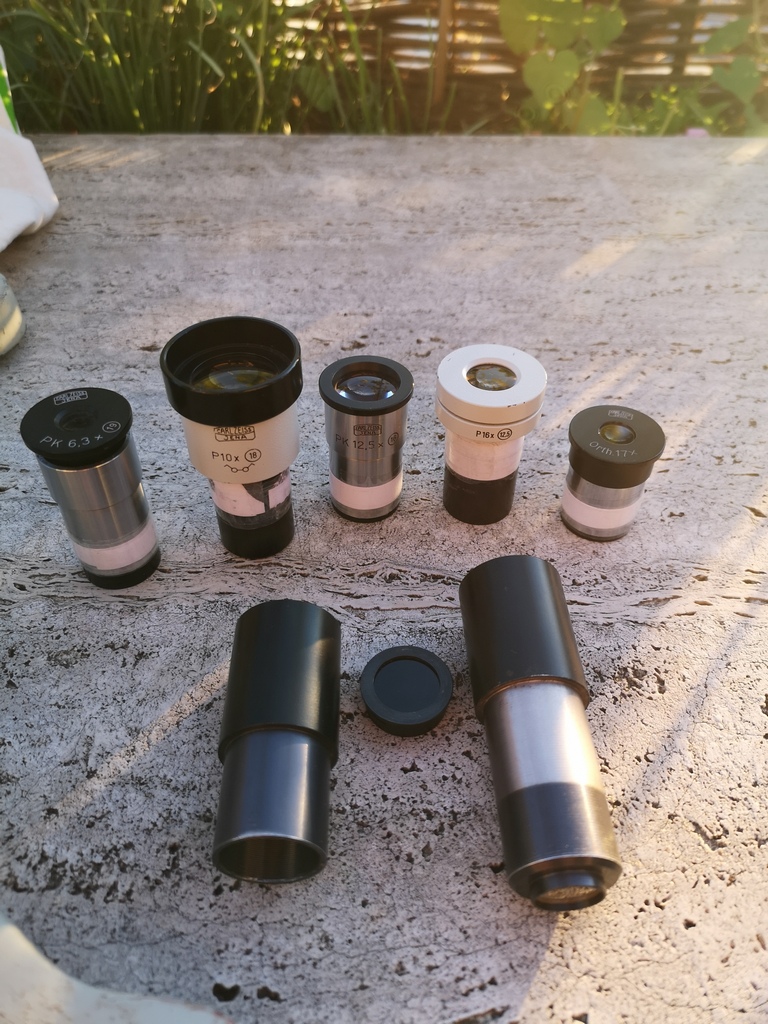 Es gibt natürlich immer etwas zu verbessern. Also zunächst ist da die fehlende Fokuslage für die Nutzung der Mikroskopokulare o h n e Barlow-Linse. Dann natürlich die Okularsteckhülse. Und Okulare selbst: das beigelieferte 15er Ramsden - wie gesagt - taugt mal nix. Und entwertet den "kleinen Russen" völlig. Aber für Abhilfe war schon gesorgt und so kam dann gestern am 22.09. ein ganzer Satz Zeiss-Mikroskopokulare ins Haus. Nicht, das nicht schon einige Mikroskopokulare vorhanden waren, aber das diesbezügliche Angebot war sehr gut, so langte ich zu. Und bei diesem "Konvolut" waren auch einige echte Schätzchen dabei ... so ein 14.7mm(17x) Ortho und eine "PK 12.5x"; also eines mit 20mm Brennweite. Beim Reinigen stellte sich heraus, dass dieses auch orthoskopischer Bauweise ist; eine Front-(augenseitige) Linse und ein Block von drei verkitteten Linsen innerhalb des Okulars.