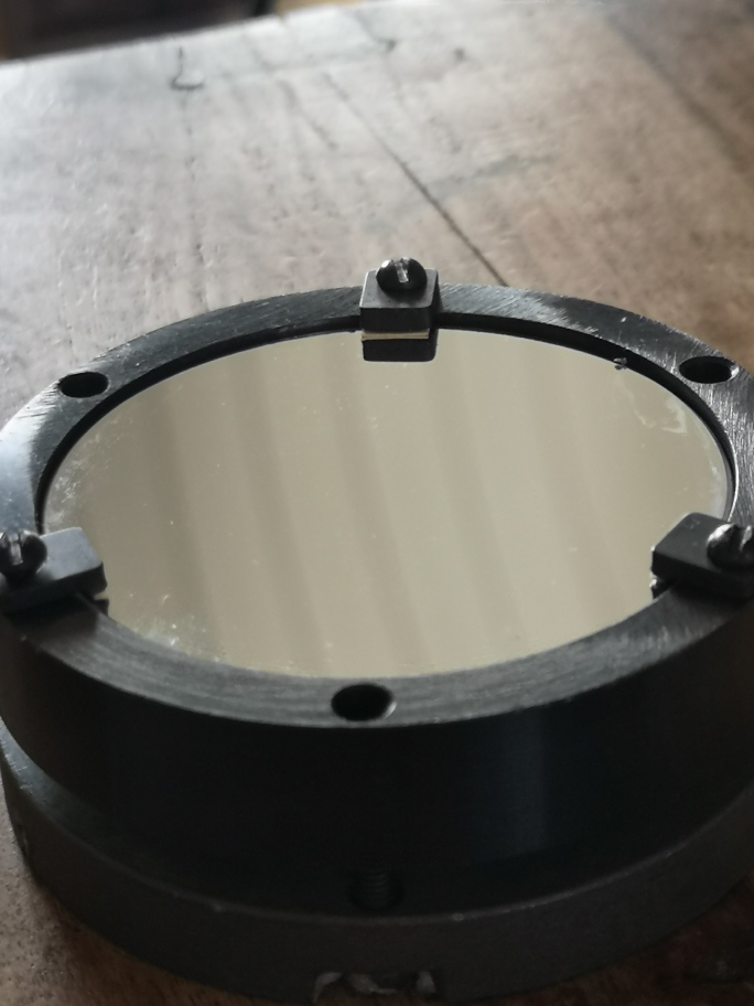 Hinten an der Spiegelfassung waren zum Abdecken der Justageschrauben drei Stücke Knetgummi angebracht. Sollte wohl die Justage schützen; auch noch nicht gesehen, sowas. Mit Hilfe dieser Schrauben den Spiegel bzw. desse Einzelfassung so weit wie möglich nach "oben", sprich - Richtung Okular hin - verschoben. Nach getaner Spiegelwäsche wieder alles zusammengebaut; dabei auch noch den Spiegel selbst justiert ... und ... Test: das 17er Mikroskop-Ortho rein und auf den viele KM entfernten Wald gehalten - jo passt! Nun die Sonne mit Filter .. passt!! Klasse. Dies probierte ich dann auch mit den anderen Okularen, passt alles. Klasse! Dann ist der "Lüttsche" ja nun komplett einsatzbereit.