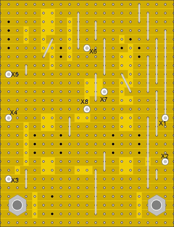 Nach dem Einlöten aller Drahtbrücken empfiehlt es sich eine Überprüfung der Verbindungen durchzuführen und die Kurzschlußfreiheit zwischen X1 und X2 zu messen. Eine Besonderheit sei hier noch erwähnt: Die lange Drahtbrücke ganz rechts auf Bild 4, von IC3 Pin1 kommend nach Lötpin X1, wird am besten auf der Bauteilseite an X1 angelötet. Auf Bild 3 sind die Leiterbahnenunterbrechungen auch als helle Felder auf der Bauteilseite dargestellt.