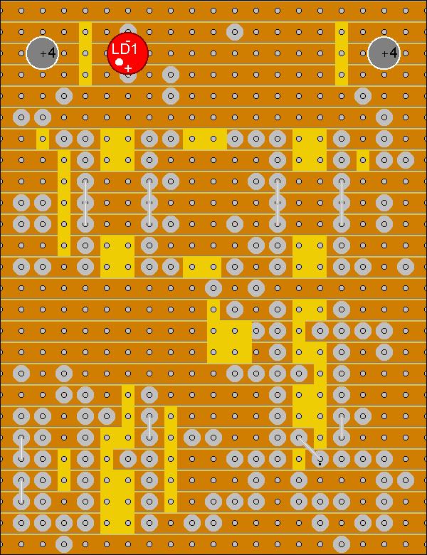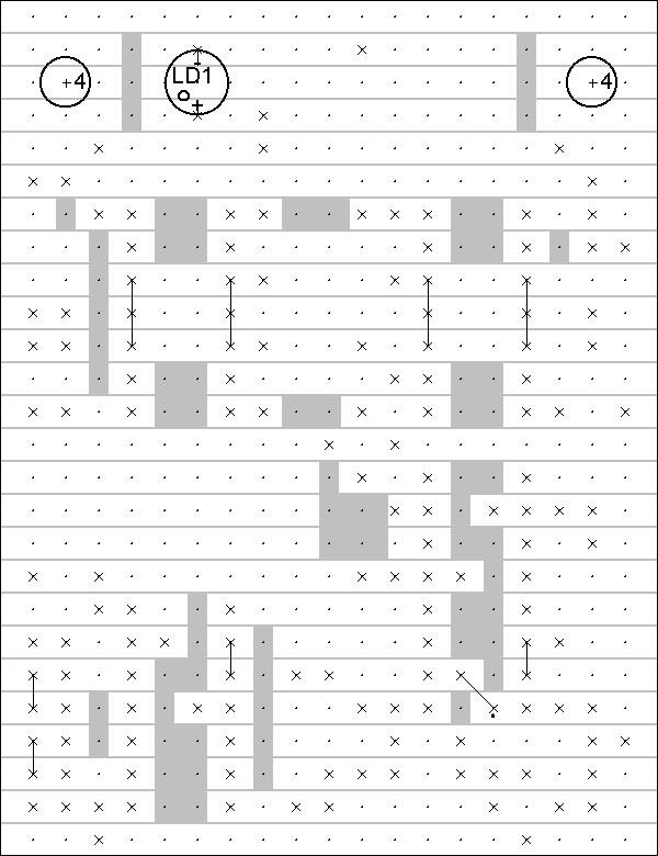 Zuerst wird die Platine abgeschnitten. 26 Lochstreifen mit einer Länge von 19 Rastern werden benötigt. Die Platine wird mit der Kupferseite nach oben auf den Tisch gelegt, dann werden alle zu trennenden Streifenabschnitte mit z.B. einem Edding-Faserstift markiert. Als Vorlage dient hierzu Bild 3. Die hellen Stellen markieren hier die ausgetrennten Stellen in den Leiterbahnen.