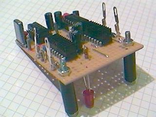 Zuerst werden die beiden Fassungen für IC1 und IC2 eingelötet. Ungeübten sei gesagt, wer das schafft packt den Rest auch! Dann folgen die anderen kleineren Bauelemente wie Kondensatoren und Widerstände. Achtung! Auf richtige Polarität der Tantal- u. Elektrolytkondensatoren achten. Jetzt noch schnell IC3, Diode und den Quarz eingelötet, dann können als vorletzte Bauteile IC4 und IC5 eingelötet werden. Diese ICs müssen deshalb eingelötet werden, weil sie einen Teil ihrer Verlustwärme über die Massepins an die Leiterbahnen abgeben.