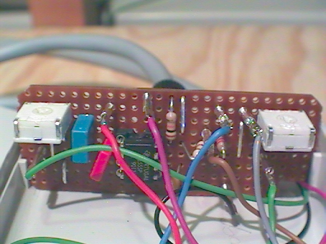 Wer mit den Drehzahldifferenzen bei der Betätigung der Tasten nicht zufrieden ist, kann an den Trimmern P2 und P3 die Diifferenzen in einem Bereich von etwa 5-15 Hz verändern. Am besten man stellt P2 (auf Bild 12 rechts) so ein, daß die Mittelstellung von Poti P1 etwa der Frequenz von 50Hz, also der des Quarzes entspricht. Beim Verstellen von P2 wird auch die Grundstellung von P1 beeinflusst. Steht P1 etwa auf Mittelstellung, und die Frequenz entspricht etwa der der Quarzfrequenz, dann haben wir bei Betätigen von Taster S1 einen Sprung um 10 Hz auf 60Hz. So ist die Schaltung ausgelegt. Mit dem Trimmer P3 (auf Bild 12 links) wird dann der ein Sprung von 10Hz auf 50Hz eingestellt. Das Verstellen von P3 beeinflusst die Stellung von P1 nicht. Wer kein Oszilloskop hat muß halt nach Gefühl einstellen. Die beste Einstellung habe ich erreicht, wenn beide Trimmer ( aus Sicht von Bild 12) mit dem Pfeilzeiger auf "7Uhr" zeigen.