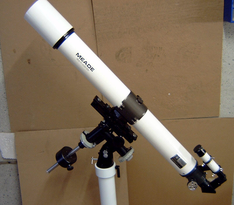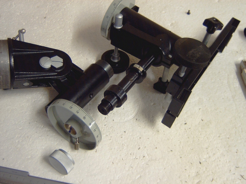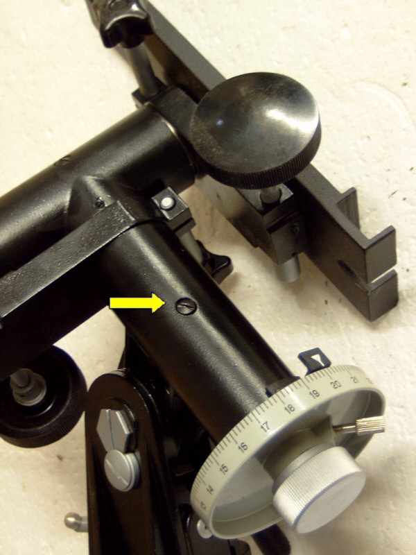 Zum Teil aus reiner Neugier, zum Teil aber auch mit dem Hintergedanken, meine TAL-1 Montierung ( ohne Motor ) etwas zu tunen oder generell einmal zu warten, beschloss ich die Montierung zu zerlegen. Was dabei herauskam, habe ich hier in einem kleinen Bildbericht beschrieben. Grundsätzlich ist die TAL-1 eine grundsolide Montierung, die recht einfach aufgebaut ist. Vielleicht ist sie jedoch gerade deshalb so robust und zuverlässig. Ich betreibe auf dieser Montierung zur Zeit noch einen 90/1000 mm Fraunhofer Refraktor von Meade, den Explorer 395. Zwar hat das Gerät eine bescheidene Öffnung, belastet eine Montierung aber schon mit einem ordentlichen Hebel. Eine EQ-3 war damit schon grenzwertig belastet ! Auf der TAL-1 Montierung sitzt der FH bombenfest und zitterfrei. Wie zerlegt man nun die Montierung ? Im Grunde ist die Arbeit für beide Achsen völlig identisch und in ein paar Minuten erledigt. Wegen des einfachen Konstruktionsprinzip muss man sich nur mit wenigen Teilen herumschlagen - anders als bei China-Montierungen, die aus 10000 Einzelteilen bestehen und doch nicht immer stabiler sind... Um die Achsen aus dem Achsgehäuse ziehen zu können, müssen zunächst die Feststellschrauben und Teilkreise abgezogen werden. Dann löst man die im linken Bild markierte Schraube - Vorsicht : die Schraube ist sehr klein und sehr kurz - nicht verlieren. Schwups ! Schon kann man die Pol-Achse aus dem Gehäuse ziehen - siehe Bild rechts. Dabei taucht die erste Überraschung auf : ich dachte bisher immer, dass die Achsen kugelgelagert seien. Dies ist aber nicht der Fall. Vielmehr verbaut TAL hier Gleitlager bzw. Gleitbuchsen. Das muss aber kein Nachteil sein ! Gerade bei kleinen Montierungen und entsprechend kleineren Achsdurchmessern sind Gleitlager oft präziser als gleich grosse Kugellager. In der Tat gibt es bei dieser Montierung auch überhaupt nichts an den Laufeigenschaften der Achsen zu bemängeln. Sie drehen sich spiel- und ruckelfrei, so wie es sein soll