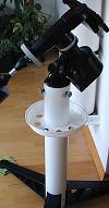 An die Unterseite des Tellers habe ich im 120-Grad-Abstand drei weiß lackierte Eisenwinkel (ca. 4 cm) angeschraubt.[Foto] WICHTIG: um Schaden am Okularmaterial zu vermeiden, Schraubenköpfe auf der Oberseite der Ablage "verkleiden", oder aber z.B. Schrauben mit flachem Kunststoffkopf verwenden. Beim Anschrauben der Winkel 1-2 mm berücksichtigen, um die an der Säule anliegenden Schenkel vorher mit Filz zu bekleben.