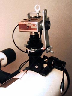 Vor einiger Zeit legte ich mir eine Canon PS 10 Digitalkamera mit 2,1 Megapixel zu. Eigentlich war sie nur für 'weltliche' Fotos vorgesehen. Da dachte ich mir, warum nicht auch mal am Teleskop probieren. Also: Rohrschelle um den Okularauszug, Flacheisen mit Langloch (um sich den verschiedenen Okularlängen anzupassen) drangeschraubt und an dem Flacheisen mit einer Fotoschraube die Kamera befestigt. Mit dieser einfachen Konstruktion geht die Kamera während des Scharfstellens mit. Die Kamera selbst hat ja kein Gewinde am Objektiv. Ich war ganz schön überrascht, wie einfach man damit Bilder mit hoher Qualität erziehen kann. Bilder, die ich mit meiner Spiegelreflex auch nach viel herumprobieren nicht zustandebrachte. Die Fokussierung ist sehr einfach, weil man das Bild am LCD-Monitor ständig verfolgen kann. Der frißt allerdings sehr viel Strom, ein voller Akku ist im Winter oft schon nach einer halben Stunde am Ende. Ein Ersatzakku ist deshalb nicht zu verachten.
