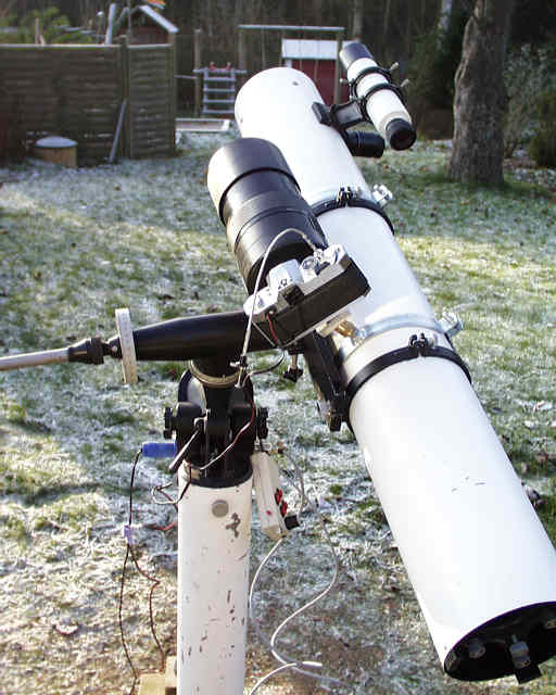 Mit diesem Aufbau wie ihr ihn auf den Bildern seht, gelang mir eine Aufnahme, bei dem ich mit der Russentonne als Aufnahmeoptik und mit dem TAL2M (EZB2) ganze 45 Minuten nachgeführt habe. Dabei entstand die die Aufnahme unten. Eigentlich wollte ich den Hantelnebel M27 aufnehmen. Beim Ausrichten der Russentonne erwischte ich allerdings nicht den gewünschten Stern 14 Vul sondern 17 Vul etwas weiter östlich. Leider entwischte mir M27 somit :-(