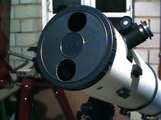 Die Scheinerblende wird vor die Teleskopöffnung gestetzt. Fragt mich jetzt bloss nicht wie das im einzelnen genau funktioniert. Jedenfalls "schielt" das Teleskop, wenn es nicht richtig auf ein Objekt fokussiert ist. Das heisst, bei defokussierten Teleskop sieht man nur Doppelsterne. Diese Doppelsterne, es können auch Doppelplaneten sein, muß man nun durch drehen am Okularauszug (->Fokussieren) in Deckung bringen. Selbst auf der Mattscheibe eine Spiegelreflexkamera geht das schon ganz ordentlich. Das Lichtsammelvermögen des Teleskops wird natürlich während der Scheinerfokussierung herabgesetzt, da ein großer Teil der Öffnung abgedeckt ist. Nach erfolreichen Fokussieren, wird die Blende abgenommen, und es kann belichtet werden.