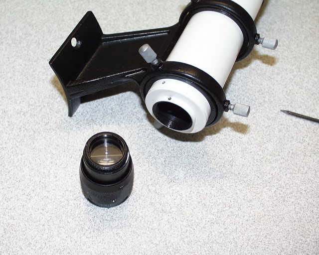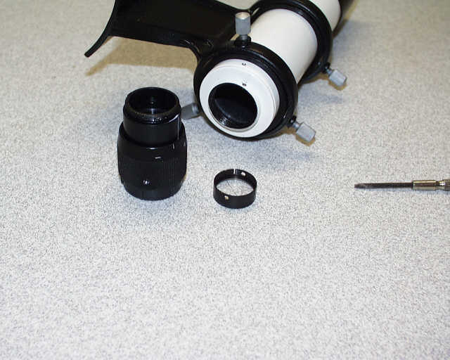 Am Hals des Suchertubus, dort wo die Okularaufnahme eingeschraubt ist, sitzt eine kleine Madenschraube. Diese Madenschraube wird mit einem kleinen Uhrmacherdreher etwas gelöst. Nur 1-2 Umdrehungen. Dann kann die Okularaufnahme, es handelt sich um einen kleinen Helicalfokusierer, abgeschraubt werden. Eventuell ist bei ersten Lösen ein kleiner Ruck notwendig. Keine Sorge, die Okularaufnahme lässt sich herausschrauben, es geht nichts kaputt. Man sollte vielleicht beachten dass es nicht in der Nähe staubt.