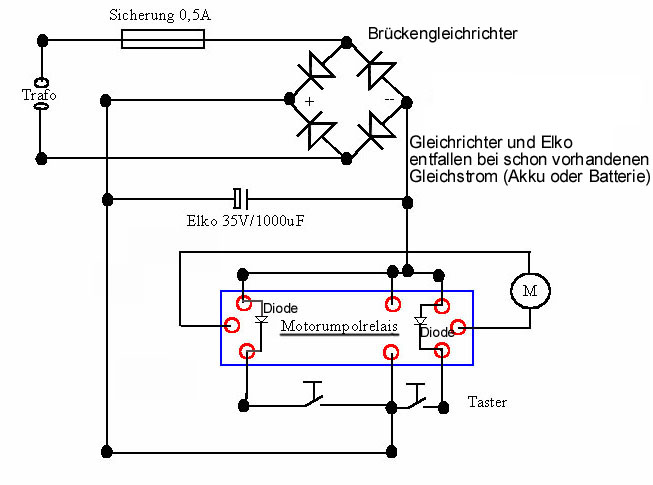Was man sonst noch braucht, hängt davon ab, ob man bereits am Teleskop was Elektrisches gebastelt hat. Wer EZB1 und die Handsteuerbox EZB2 bereits hat, braucht nur 2 Taster in die Box einzubauen (hoffentlich sind noch zwei Adern des Kabels frei) ((Hallo Rudi, bei EZB3 sind noch 3 Adern frei, Armin ;-)), diese an das Motorumpolrelais angeschlossen und dann weiter zum Getriebemotor. So habe ich das gemacht, ansonsten sucht man sich im Katalog ein angenehmes Gehäuse aus. Zwei Taster und ein dreiadriges Kabel mit ca. 2 Meter Länge werden hierfür noch gebraucht. Wenn man nun weiter mit dem Trafo arbeitet, braucht man noch einen Brückengleichrichter (z.B. 501433; 0,77 ) mit Elektrolyt-Kondensator (z.B. 472549; 0,49 ). Ich hab dann noch einen Sicherungshalter (533866; 0,26 ) mit Sicherung (0,5 Ampere) eingeflickt. Ich hab's nun mal immer schön abgesichert. Diese Teile zusammen mit dem Motorumpolrelais und einer Kontroll-LED habe ich zusammen auf einer Platine (ich ätze mir die Platinen selber) im Motorgehäuse untergebracht. Man kann's natürlich auch so machen, wie es Armin beim Bauplan zu EZB3 gemacht hat. Zum Fokusmotor braucht man noch ein Stück 2-adriges Kabel, wobei ich dieses an beiden Seiten mit Cinch-Stecker bzw. -buchsen abtrennen kann. Kommt ja desöfteren vor, daß man den Tubus abschraubt, da würde ein festmontiertes Kabel nur zu Wutausbrüchen führen. Hier der Schaltplan: