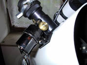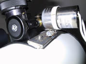 Jetzt wird's schon schwieriger: Diese Schlauberger haben dem Motor eine 6 mm Welle und dem Schneckenrad eine 4 mm Bohrung gegeben. Habe nichts passenderes gefunden. War aber auch nicht weiter schlimm: Den Motor Strom gegeben, damit die Welle sich dreht, und diese dann an eine laufende Bandschleife gehalten. So erhält man eine sauber abgedrehte Welle, hat nur 2 Minuten gedauert. Mit Sekundenkleber habe ich das Schneckenrad noch zusätzlich am Motor befestigt. Als nächstes muß die untere Schraube des Okularauszuges durch eine um die Flacheisendicke längere ersetzt werden. Das Eisen habe ich zusätzlich mit einem doppelseitigen Klebeband befestigt, aber erst ganz zum Schluß anpappen! Im Bild sieht man, daß ich die Schlauchschelle angeschweißt habe, da muß man ganz vorsichtig umgehen, damit sich die Schraube derselbigen noch dreht.