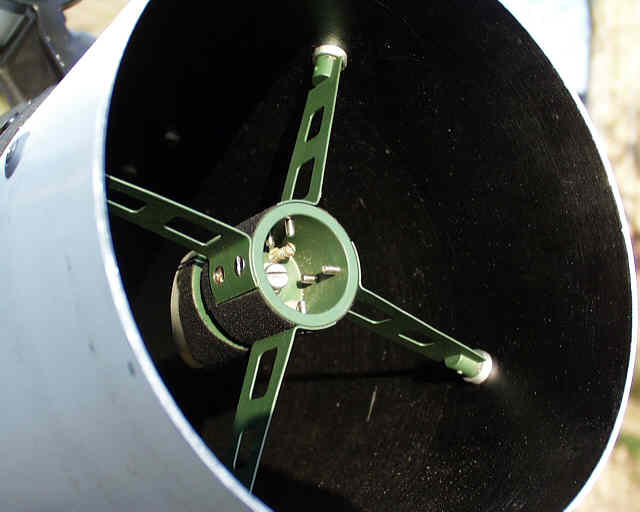 Mit den vier Schrauben aussen am Tubusrand, wird die Fangspiegelspinne gespannt. Dieses Spannen muß mit Gefühl gemacht werden. Mein TAL stand im Sommer eine Zeitlang in der Sonne, dabei strahlte die Sonne seitlich vorne in den geschwärzen Tubus, dieser erwärmte sich und - KNACK - riss eine Schraube (siehe Bild) an der Fangspiegelhalterung ab. Ich hatte die Spinne zu stramm eingespannt. Die Spinne soll nicht flattern, das "hohe C" soll man aber auch nicht damit anstimmen können.